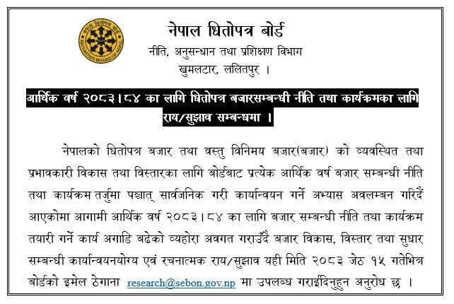| विश्व लगानीकर्ता सप्ताह २०२३ (World Investor Week 2023) आयोजना सम्बन्धमा। | 2023-10-01 | Nepali | |